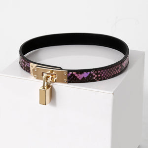 Eleva tu juego de bondage con este lujoso conjunto de collar y esposas de doble propósito. Hecho de cuero de alta calidad con un intrincado patrón de piel de serpiente, esta pieza premium ofrece estilo y funcionalidad, pasando sin esfuerzo de un collar sofisticado a esposas seguras. Perfecto para quienes buscan versatilidad y emoción en sus aventuras BDSM.