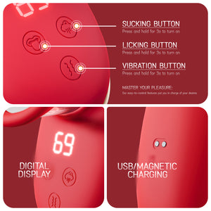Explore a myriad of sensations with this sucking vibrator rose sex toy. Boasting 3 unique sucking intensities that simulate the sensation of oral play, 9 tongue licking patterns and a range of vibrating modes provide an incredibly realistic experience. This adult sex toy female vibrator offers a symphony of sensations that will take you to new heights of pleasure. This suction vibrator allows you to customize your journey towards ecstasy, ensuring every desire is met.