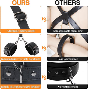 Hecho de cuero PU suave y duradero y hebillas de metal, este kit de bondage ofrece tanto comodidad como durabilidad. Ya sea que te entregues a un juego intenso o disfrutes de un uso prolongado, el material de alta calidad asegura una experiencia placentera en cada uso.