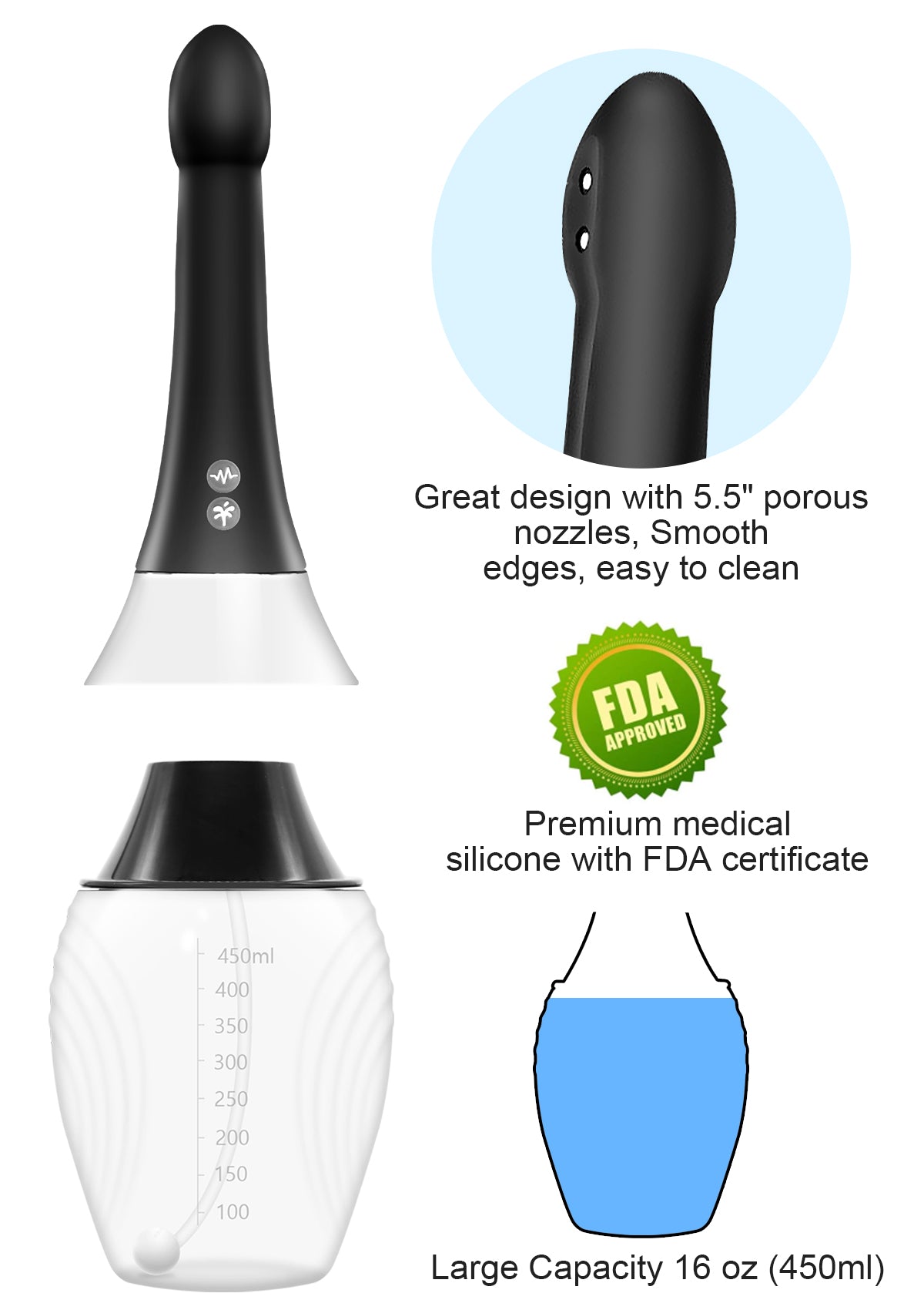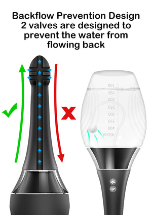 Diseño Ergonómico y Antirretorno El diseño innovador permite que la boquilla en forma de arco se adapte mejor al cuerpo, y la botella antideslizante facilite el agarre. El enema ducha tiene dos válvulas unidireccionales, que pueden prevenir eficazmente el reflujo de agua sucia.